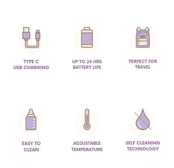 The Milk Warmer uses a super fast charger with a USB-C connection. The charging cable is conveniently included with the Milk Warmer. Thanks to its fast charging capability, the Milk Warmer can be fully charged in just 1 hour.